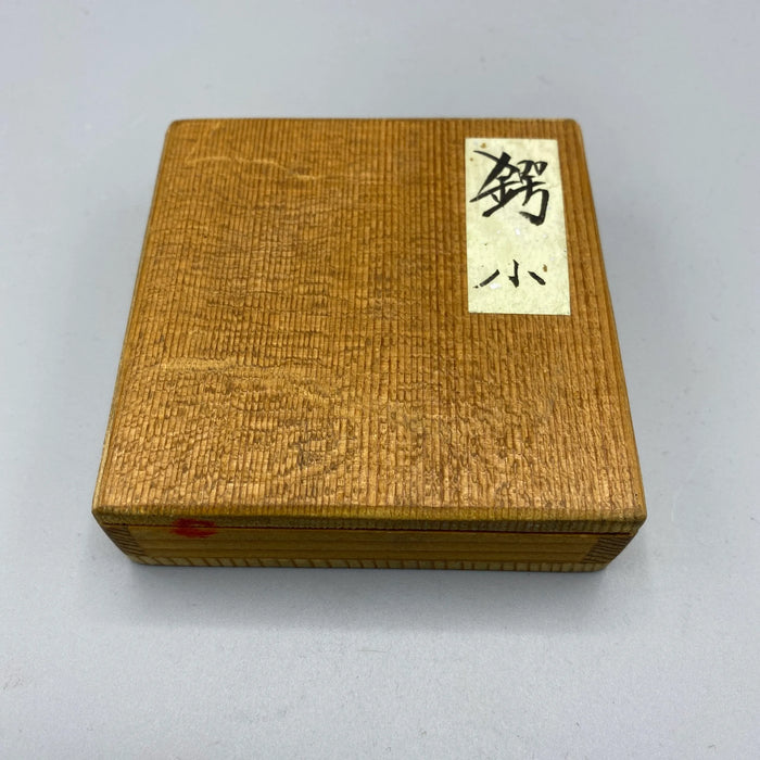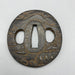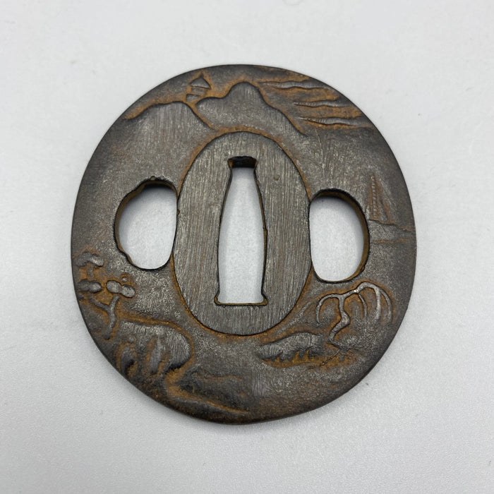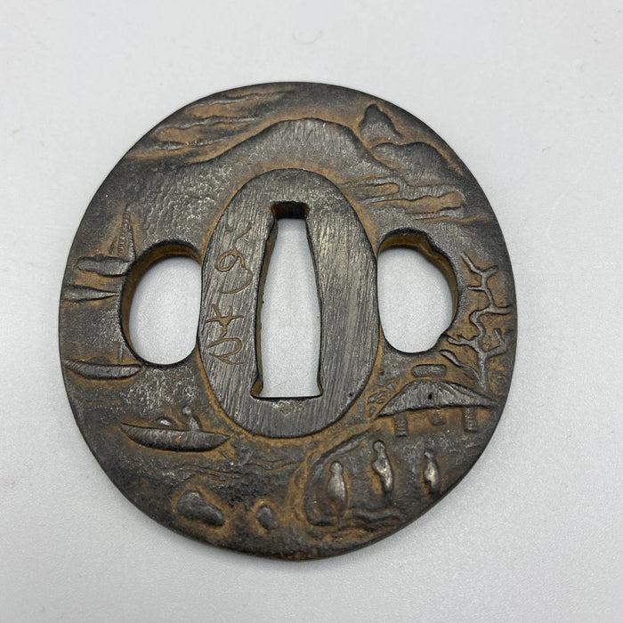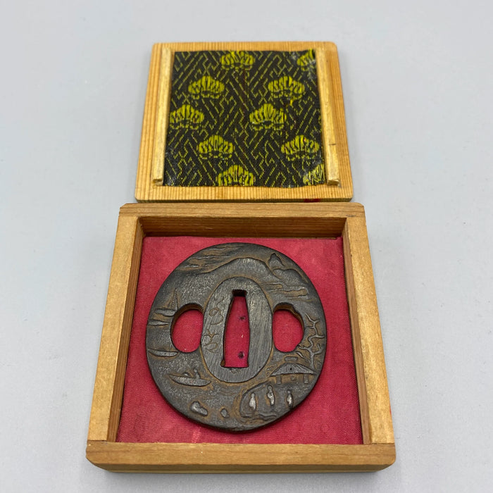 Tsuba con scenario bucolico giapponese, firma arcaica non traducibile periodo Edo. Con scatola.