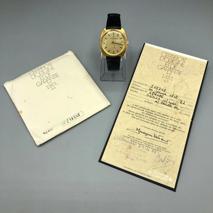 Orologio da polso Vacheron Constantin in oro 18kt modello 42011, movimento 21 rubini. Macchina perfettamente funzionante, accompagnata da certificato originale VC del 1980. Cinturino in coccodrillo originale VC con chiusura anch’essa firmata VC in oro 18kt.