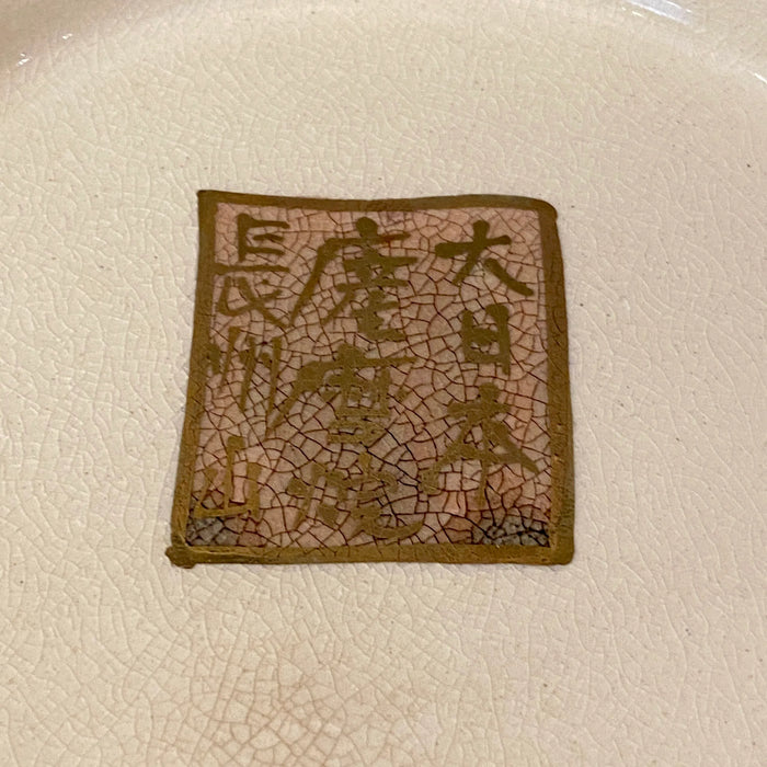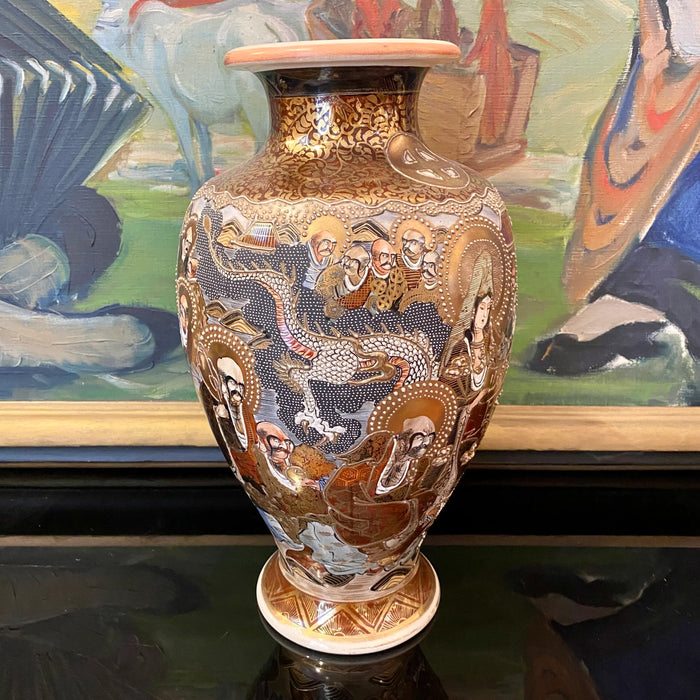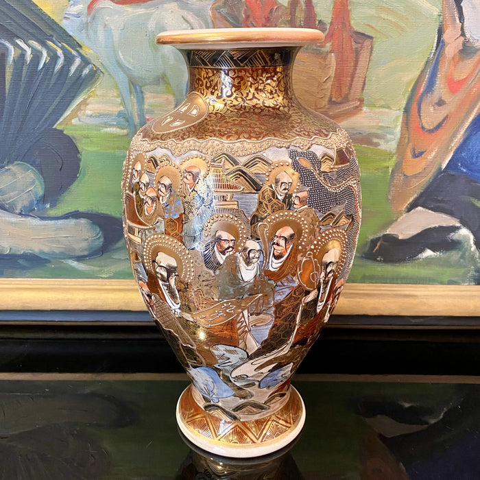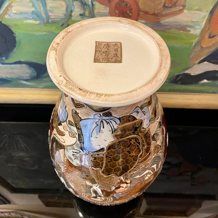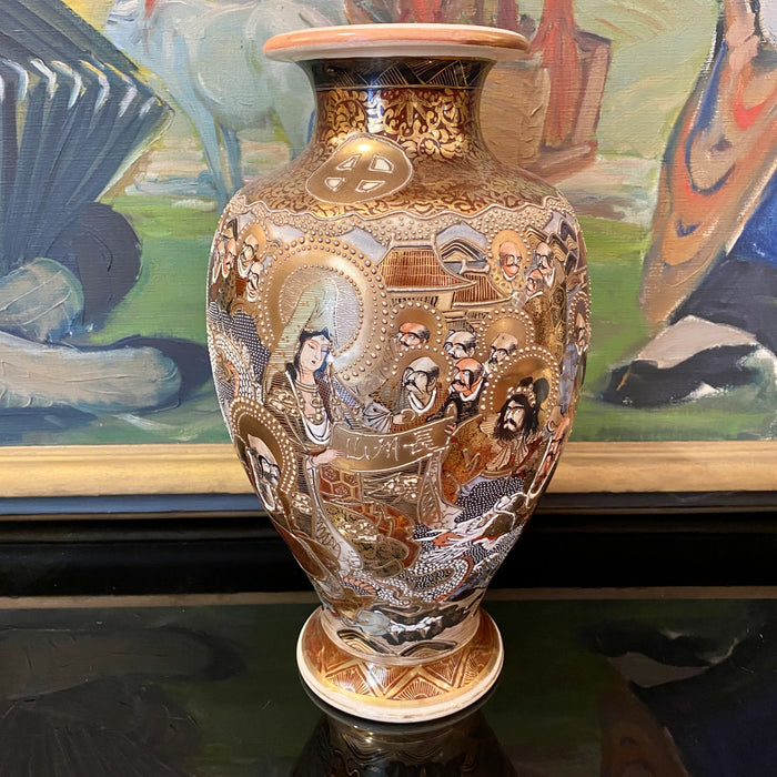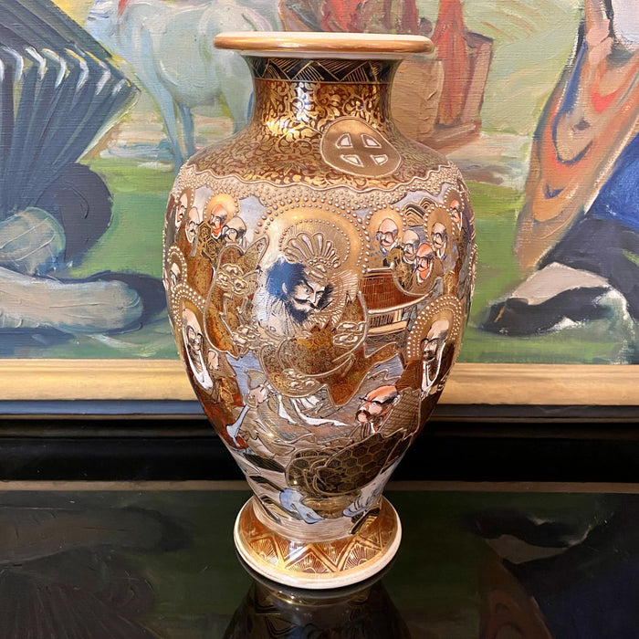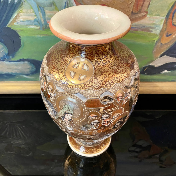 Vaso Choshuzan Satsuma decorato a oro zecchino raffigurante divinità Giapponesi. Sul collo due Mon Satsuma imperiali. Firmato sul fondo.